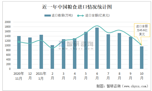 根據(jù)中國海關數(shù)據(jù)顯示:2021年10月中國糧食進口數(shù)量為968萬噸,同比下降25.2%,進口金額為45.6億美元,同比增長0.2%,2021年10月中國糧食出口數(shù)量為30萬噸,同比下降2.3%,出口金額為1.55億美元,同比增長9.1%;2021年1-10月中國糧食進口數(shù)量為13796萬噸,進口金額為612.8億美元,出口數(shù)量為274萬噸,出口金額為14.35億美元。