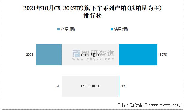 根據中國汽車工業協會數據可知:2021年10月CX-30(SUV)產量為2077輛,同比下降12.3%,銷量為3085輛,同比增長24.6%,當月產銷率為148.53%;2021年1-10月CX-30(SUV)累計產量為12670輛,同比下降10.8%,累計銷量為12958輛,同比下降7.2%,累計產銷率為102.27%;且2020年CX-30(SUV)總產量大于總銷量,積壓了庫存390輛。