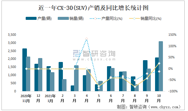 近一年CX-30(SUV)產銷及同比增長統計圖