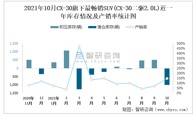 2021年10月CX-30旗下最暢銷SUV(CX-30二驅2.0L)近一年庫存情況及產銷率統計圖