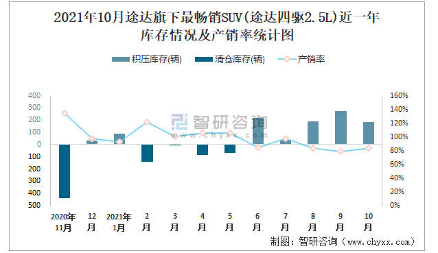 2021年10月途達旗下最暢銷SUV(途達四驅2.5L)近一年庫存情況及產銷率統計圖
