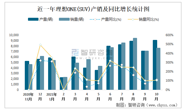 近一年理想ONE(SUV)產(chǎn)銷及同比增長(zhǎng)統(tǒng)計(jì)圖