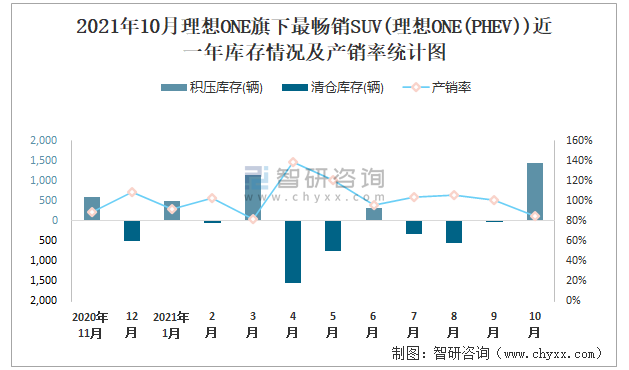 2021年10月理想ONE旗下最暢銷SUV(理想ONE(PHEV))近一年庫(kù)存情況及產(chǎn)銷率統(tǒng)計(jì)圖