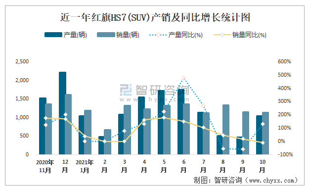 近一年紅旗HS7(SUV)產(chǎn)銷及同比增長統(tǒng)計(jì)圖