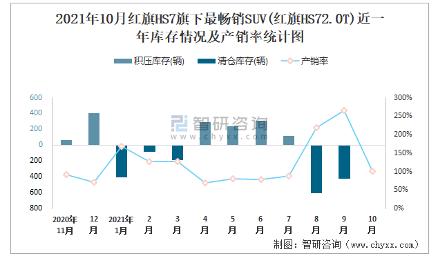 2021年10月紅旗HS7旗下最暢銷SUV(紅旗HS72.0T)近一年庫存情況及產(chǎn)銷率統(tǒng)計(jì)圖