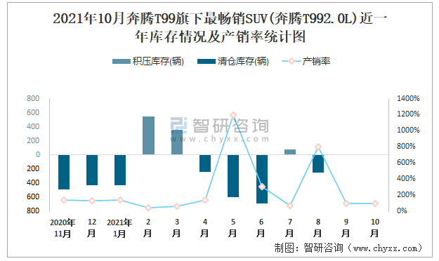 2021年10月奔騰T99旗下最暢銷SUV(奔騰T992.0L)近一年庫存情況及產銷率統計圖