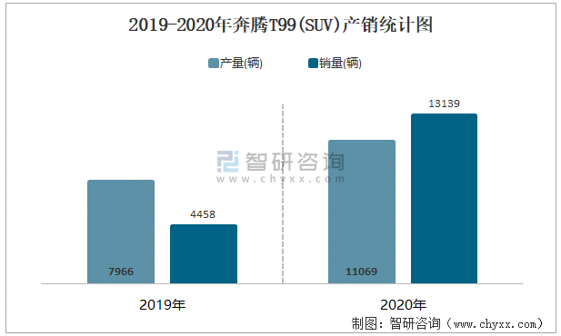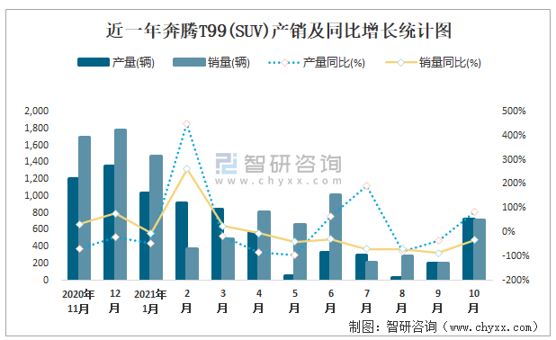 根據中國汽車工業協會數據可知:2021年10月奔騰T99(SUV)產量為727輛,同比增長85.9%,銷量為716輛,同比下降32.3%,當月產銷率為98.49%;2021年1-10月奔騰T99(SUV)累計產量為5023輛,同比下降41%,累計銷量為6241輛,同比下降35.4%,累計產銷率為124.25%;2019-2020年奔騰T99(SUV)產銷量大幅度增加,且近2年總產量大于總銷量,積壓了庫存1438輛。