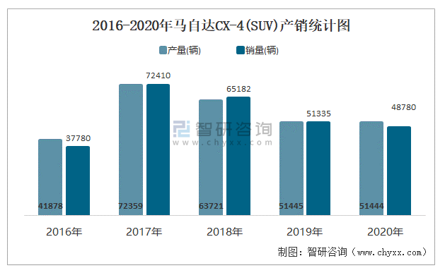 2016-2020年馬自達CX-4(SUV)產銷統計圖