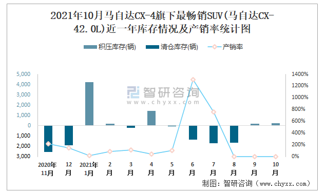 2021年10月馬自達CX-4旗下最暢銷SUV(馬自達CX-42.0L)近一年庫存情況及產銷率統計圖