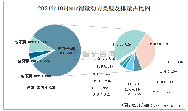 動力為燃油-汽油的SUV仍為銷售的主要車型,占比81.92%,其中1.5排量的燃油SUV較為暢銷;2021年10月新能源-BEV的SUV銷售占比10.11%,是最暢銷的新能源SUV,其他兩款新能源PHEV、HEV的SUV也占有少量市場份額,相較于新能源轎車(BEV、PHEV、HEV三款新能源轎車2021年10月銷量占有26.08%的市場份額),新能源SUV市場占有份額還有提升空間;隨著國家對新能源汽車政策扶持力度的加大、核心技術的升級、基礎設施的完善,未來新能源汽車將成為汽車產業轉型發展的主要方向。