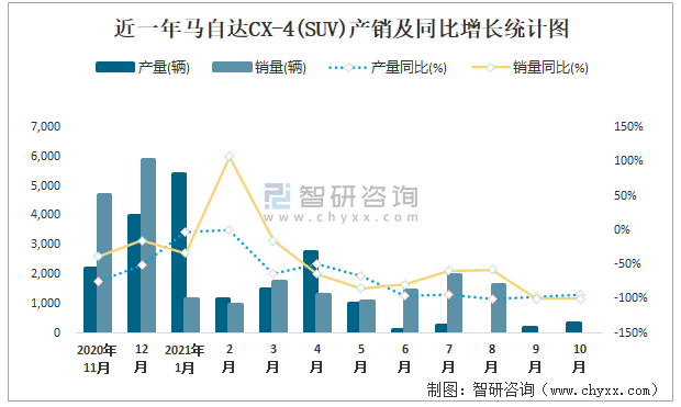 近一年馬自達CX-4(SUV)產銷及同比增長統計圖