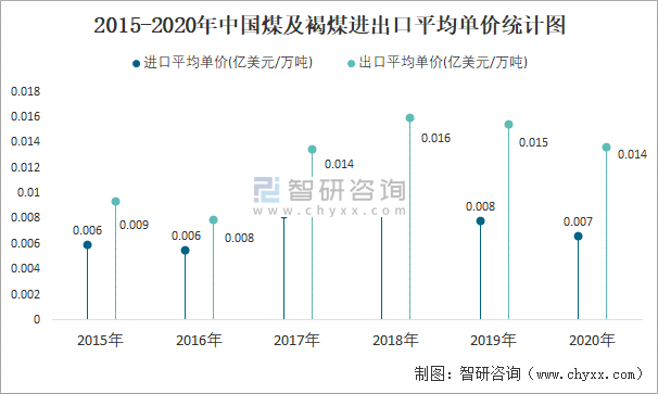 2015-2020年中國煤及褐煤進(jìn)出口平均單價(jià)統(tǒng)計(jì)圖