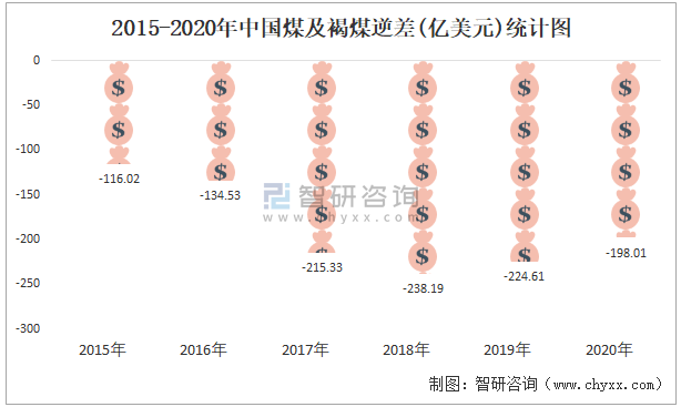 2015-2020年中國煤及褐煤逆差(億美元)統(tǒng)計(jì)圖