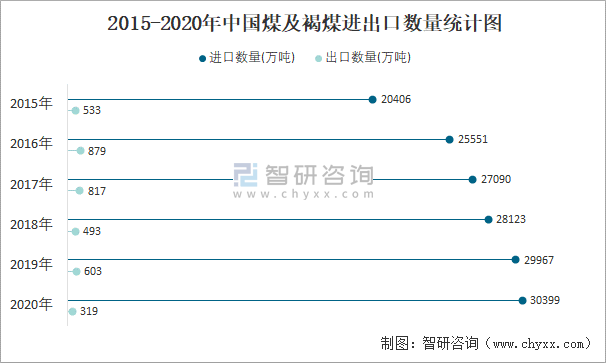2015-2020年中國煤及褐煤進(jìn)出口數(shù)量統(tǒng)計(jì)圖