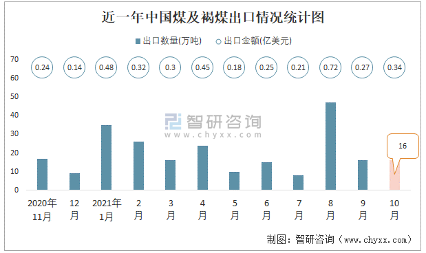近一年中國煤及褐煤出口情況統(tǒng)計(jì)圖
