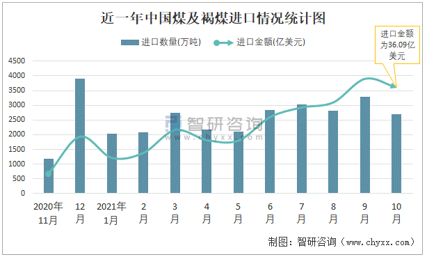 近一年中國煤及褐煤進(jìn)口情況統(tǒng)計(jì)圖