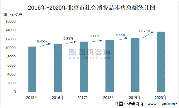 根據國家統計局數據可知:2015年-2020年北京市的社會消費品零售總額在2020年達到最高,為13716.4億元,其同比增幅也為2015年-2020年中最大,較2019年增長11.79%,2020年北京市月均社會消費品零售總額為1143億元。