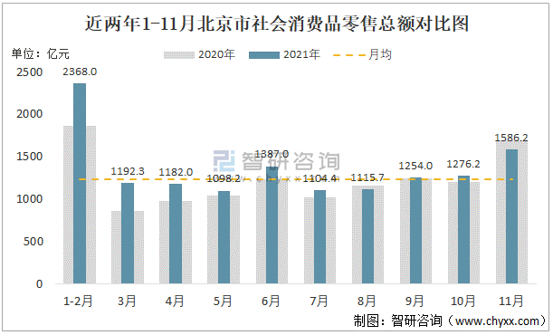 根據國家統計局數據可知:2021年1-11月北京市累計社會消費品零售總額為13564億元,其中11月北京市社會消費品零售總額為1586.2億元,單月社會消費品零售總額環比增長24.29%;1-11月北京市月均社會消費品零售總額為1233.1億元,低于11月北京市社會消費品零售總額,高于3月、4月、5月、7月、8月的北京市社會消費品零售總額。