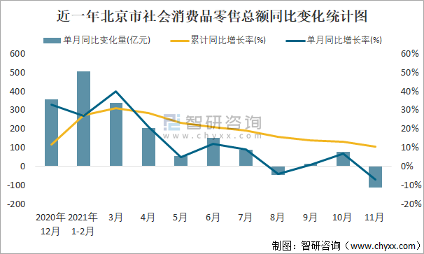 根據國家統計局數據可知:從已公布的單月數據來看,僅8月、11月的北京市社會消費品零售總額單月同比減少,單月同比增加的月份中,2020年12月的單月同比增加量最大,社會消費品零售總額較2019年同期增加356.9億元;近一年北京市社會消費品零售總額累計同比均在增長,單月同比增長率和累計同比增長率均在2021年3月達到最大。