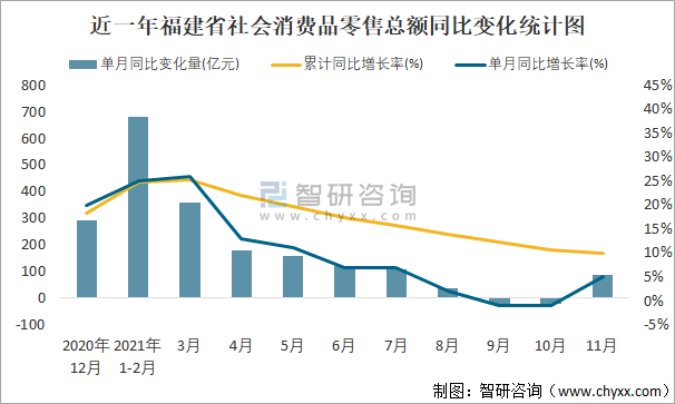 根據國家統計局數據可知:從已公布的單月數據來看,僅9月、10月的福建省社會消費品零售總額單月同比減少,單月同比增加的月份中,2021年3月的單月同比增加量最大,社會消費品零售總額較2020年同期增加359.3億元;近一年福建省社會消費品零售總額累計同比均在增長,單月同比增長率和累計同比增長率均在2021年3月達到最大。