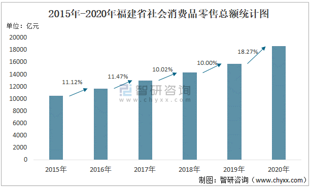 根據國家統計局數據可知:2015年-2020年福建省的社會消費品零售總額在2020年達到最高,為18626.5億元,其同比增幅也為2015年-2020年中最大,較2019年增長18.27%,2020年福建省月均社會消費品零售總額為1552.2億元。