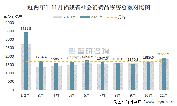 根據國家統計局數據可知:2021年1-11月福建省累計社會消費品零售總額為18577.1億元,其中11月福建省社會消費品零售總額為1908.3億元,單月社會消費品零售總額環比增長12.92%;1-11月福建省月均社會消費品零售總額為1688.8億元,低于11月福建省社會消費品零售總額,高于4月、5月、7月、8月、9月的福建省社會消費品零售總額。