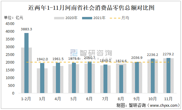 根據國家統計局數據可知:2021年1-11月河南省累計社會消費品零售總額為22039億元,其中11月河南省社會消費品零售總額為2279.2億元,單月社會消費品零售總額環比增長1.92%;1-11月河南省月均社會消費品零售總額為2003.5億元,低于11月河南省社會消費品零售總額,高于3月、4月、5月、7月、8月的河南省社會消費品零售總額。