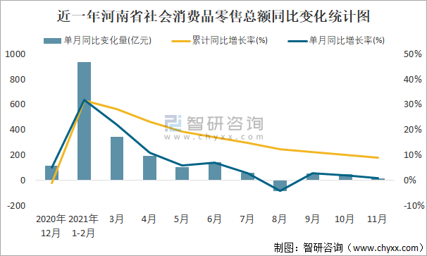 根據國家統計局數據可知:從已公布的單月數據來看,僅8月的河南省社會消費品零售總額單月同比減少,單月同比增加的月份中,2021年3月的單月同比增加量最大,社會消費品零售總額較2020年同期增加345.5億元;近一年僅2020年12月的河南省社會消費品零售總額累計同比下降,單月同比增長率和累計同比增長率均在2021年3月達到最大。