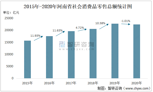 根據國家統計局數據可知:2015年-2020年河南省的社會消費品零售總額在2019年達到最高,為22733億元,較2018年增長10.38%,2020年起下降1.01%,2019年河南省月均社會消費品零售總額為1894.4億元;2015年-2020年的年度社會消費品零售總額同比增幅在2016年達到最大,由2015年的15740.4億元社會消費品零售總額增長11.93%提高至17618.4億元。
