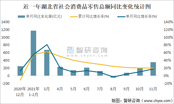 根據國家統計局數據可知:從已公布的單月數據來看,僅8月的湖北省社會消費品零售總額單月同比減少,單月同比增加的月份中,2021年3月的單月同比增加量最大,社會消費品零售總額較2020年同期增加674.2億元;近一年僅2020年12月的湖北省社會消費品零售總額累計同比下降,單月同比增長率和累計同比增長率均在2021年3月達到最大。