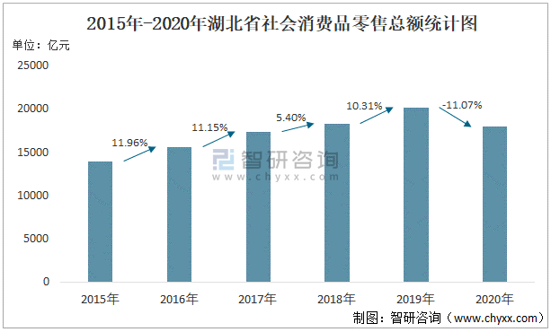 2015年-2020年湖北省社會消費品零售總額統計圖