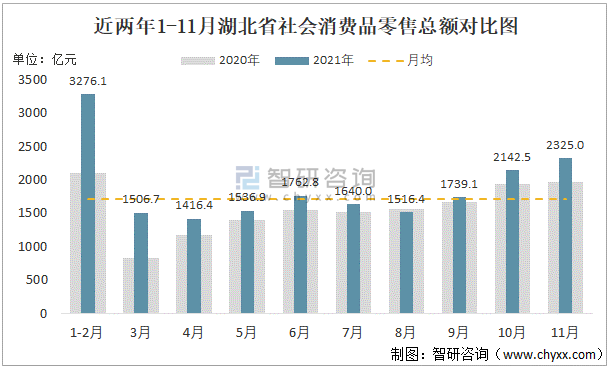 根據國家統計局數據可知:2021年1-11月湖北省累計社會消費品零售總額為18861.9億元,其中11月湖北省社會消費品零售總額為2325億元,單月社會消費品零售總額環比增長8.52%;1-11月湖北省月均社會消費品零售總額為1714.7億元,低于11月湖北省社會消費品零售總額,高于3月、4月、5月、7月、8月的湖北省社會消費品零售總額。