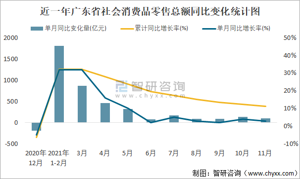 根據國家統計局數據可知:從已公布的單月數據來看,僅2020年12月的廣東省社會消費品零售總額單月同比減少,單月同比增加的月份中,2021年3月的單月同比增加量最大,社會消費品零售總額較2020年同期增加867.6億元;近一年僅2020年12月的廣東省社會消費品零售總額累計同比下降,單月同比增長率和累計同比增長率均在2021年3月達到最大。