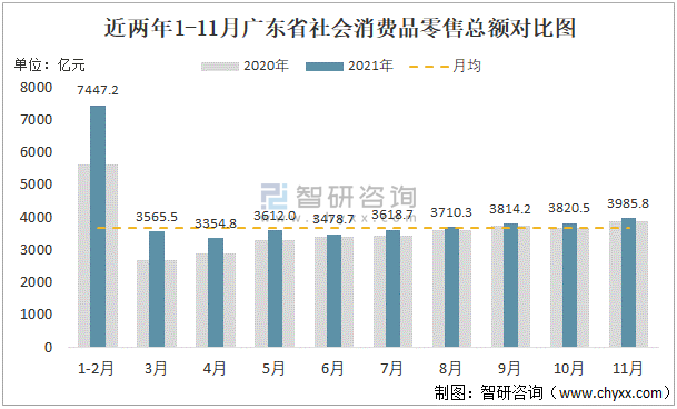 根據國家統計局數據可知:2021年1-11月廣東省累計社會消費品零售總額為40407.7億元,其中11月廣東省社會消費品零售總額為3985.8億元,單月社會消費品零售總額環比增長4.33%;1-11月廣東省月均社會消費品零售總額為3673.4億元,低于11月廣東省社會消費品零售總額,高于3月、4月、5月、6月、7月的廣東省社會消費品零售總額。