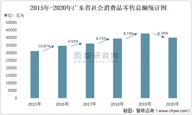 2015年-2020年廣東省社會消費品零售總額統計圖