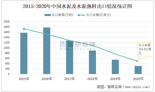 2015-2020年中國水泥及水泥熟料出口情況統(tǒng)計圖