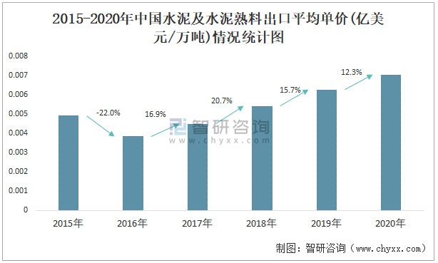 2015-2020年中國水泥及水泥熟料出口平均單價(億美元/萬噸)情況統(tǒng)計圖