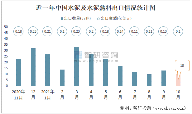 根據(jù)中國海關(guān)數(shù)據(jù)顯示:2021年10月中國水泥及水泥熟料出口數(shù)量為10萬噸,同比下降64.4%,出口金額為0.1億美元,同比下降46.4%;2021年1-10月中國水泥及水泥熟料出口數(shù)量為187萬噸,出口金額為1.51億美元。