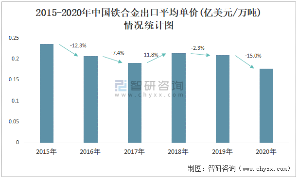 2015-2020年中國(guó)鐵合金出口平均單價(jià)(億美元/萬(wàn)噸)情況統(tǒng)計(jì)圖