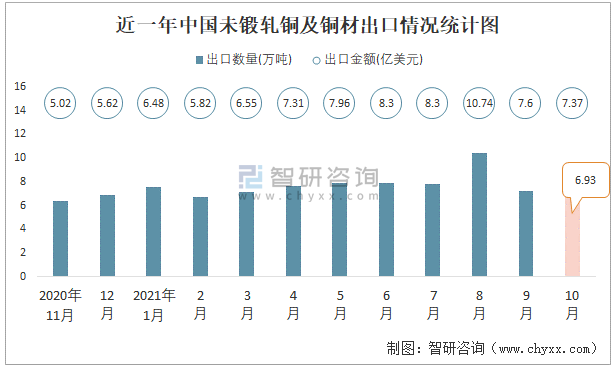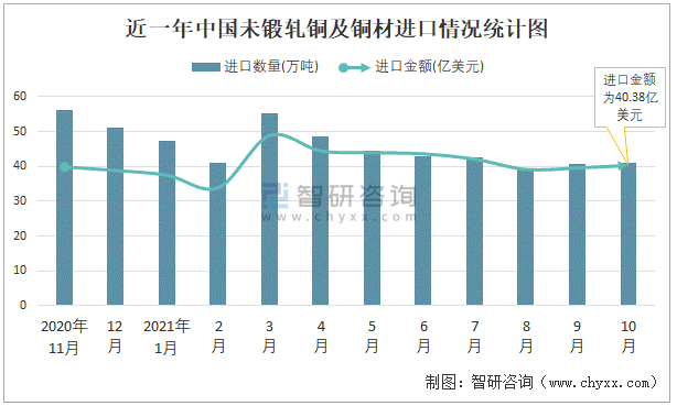 根據中國海關數據顯示:2021年10月中國未鍛軋銅及銅材進口數量為41.05萬噸,同比下降33.4%,進口金額為40.38億美元,同比下降5.8%,2021年10月中國未鍛軋銅及銅材出口數量為6.93萬噸,同比增長8.1%,出口金額為7.37億美元,同比增長52.8%;2021年1-10月中國未鍛軋銅及銅材進口數量為442.94萬噸,進口金額為415.45億美元,出口數量為77.24萬噸,出口金額為76.43億美元。
