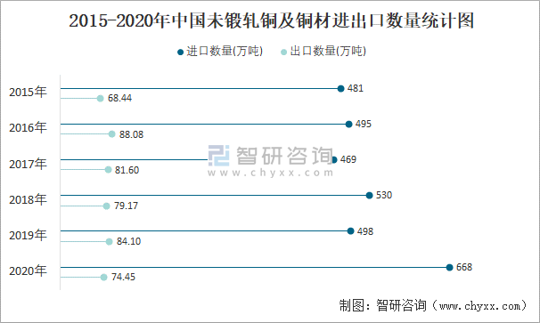 2015-2020年中國未鍛軋銅及銅材進出口數量統計圖