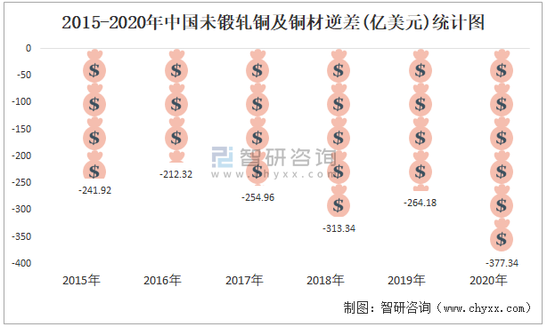 2015-2020年中國未鍛軋銅及銅材逆差(億美元)統計圖
