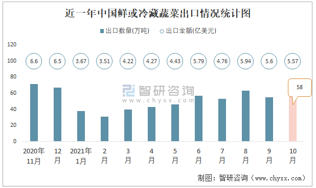 根據中國海關數據顯示:2021年10月中國鮮或冷藏蔬菜出口數量為58萬噸,同比下降4.7%,出口金額為5.57億美元,同比增長9.3%;2021年1-10月中國鮮或冷藏蔬菜出口數量為486萬噸,出口金額為47.75億美元。