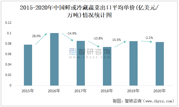 2015-2020年中國鮮或冷藏蔬菜出口平均單價(億美元/萬噸)情況統計圖