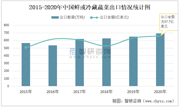 2015-2020年中國鮮或冷藏蔬菜出口情況統計圖
