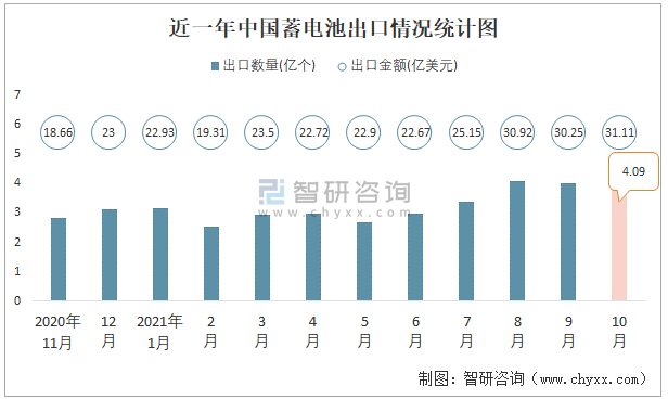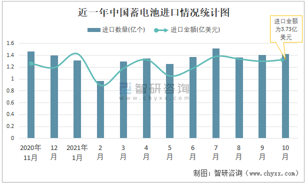 2021年10月中國蓄電池進出口數量分別為1.42億個和4.09億個