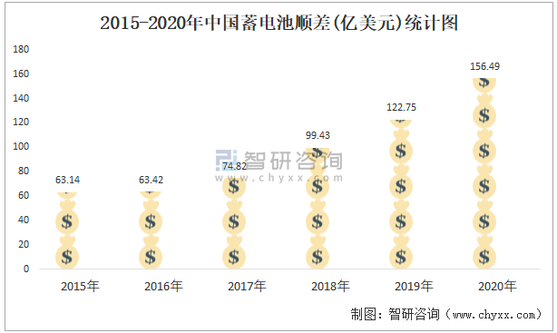 2015-2020年中國蓄電池順差(億美元)統計圖