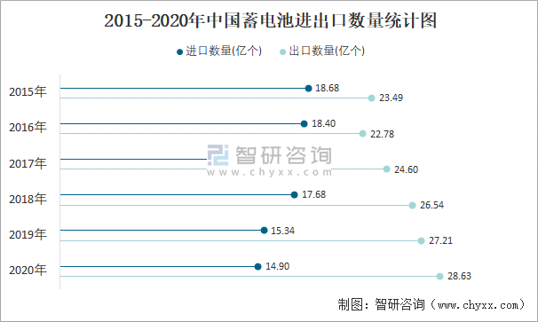 2015-2020年中國蓄電池進出口數量統計圖