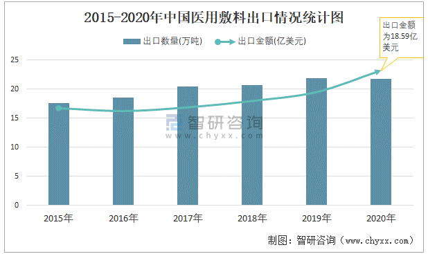 2015-2020年中國醫(yī)用敷料出口情況統(tǒng)計圖