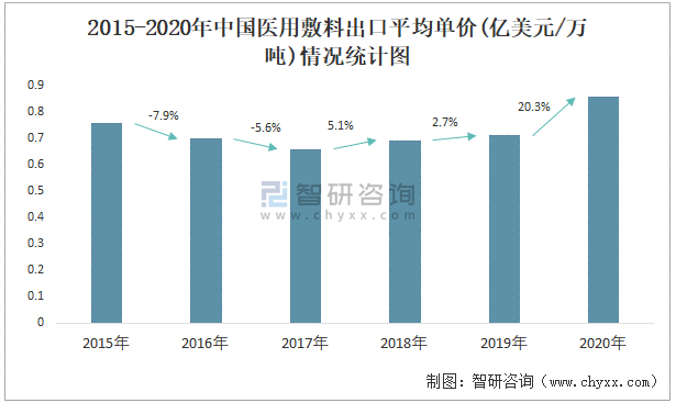 2015-2020年中國醫(yī)用敷料出口平均單價(億美元/萬噸)情況統(tǒng)計圖